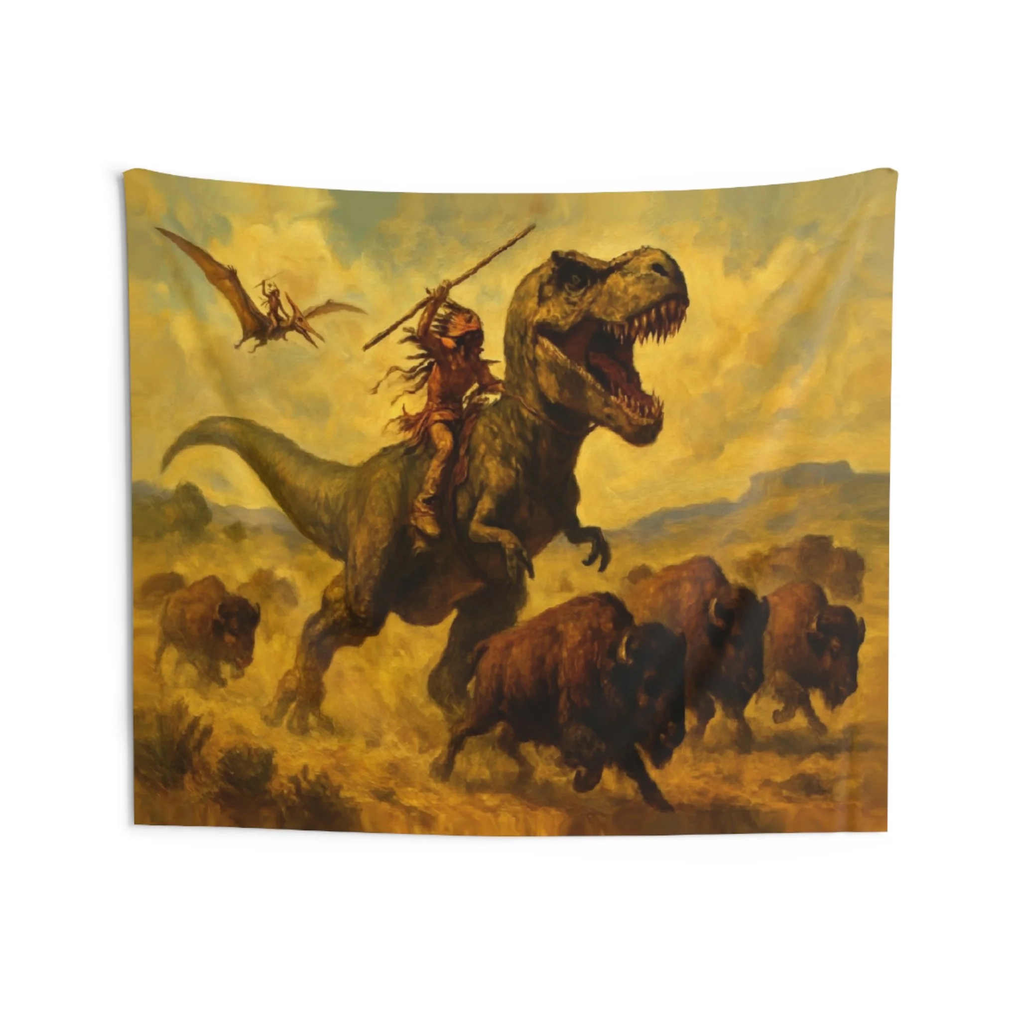 He sits high upon a towering, ancient beast, a predator from the world’s first dawn. Muscles ripple beneath its stone-hard hide, each stride shaking dust from the bones of the earth. Its roar rolls across the plains like a storm breaking open the sky, and yet the warrior atop it remains steady, balanced, utterly unafraid.