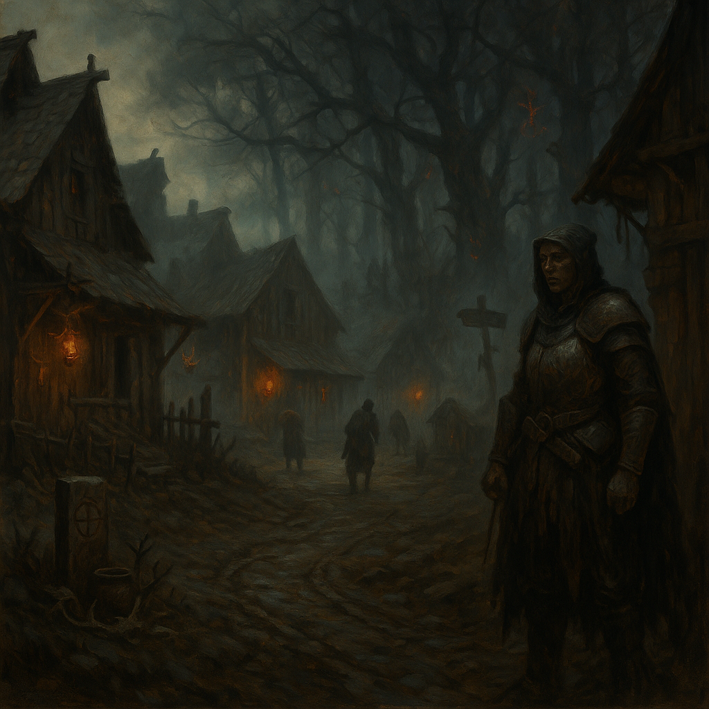 Your story begins in the hamlet of Crosspine, a splinter of civilization clinging to Whisperwood’s southern border. Once prosperous with steady timber flow to Egorian, it now survives on fear and superstition. By day, lumbermen cut only where their ancestors left warding cairns. By night, no door opens after the third bell.