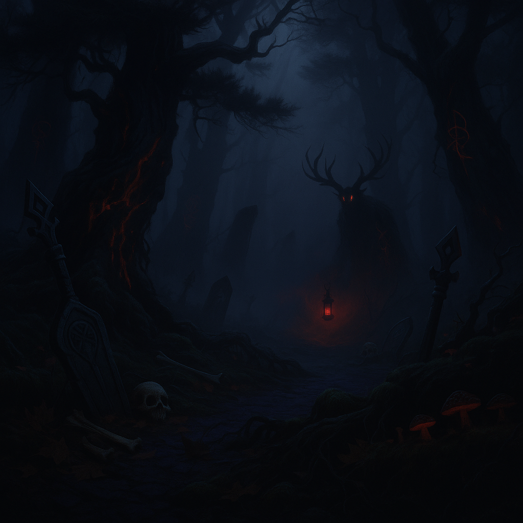 Locals claim the forest remembers the old ways, when spirits and devils shaped the hunt and mortals merely ran from it. Now, game grows scarce, villagers vanish, and horns sound in the night mist. The Devil’s Huntsman—stag-skulled, ember-mounted, judge of both the wild and the wicked—rides again.
