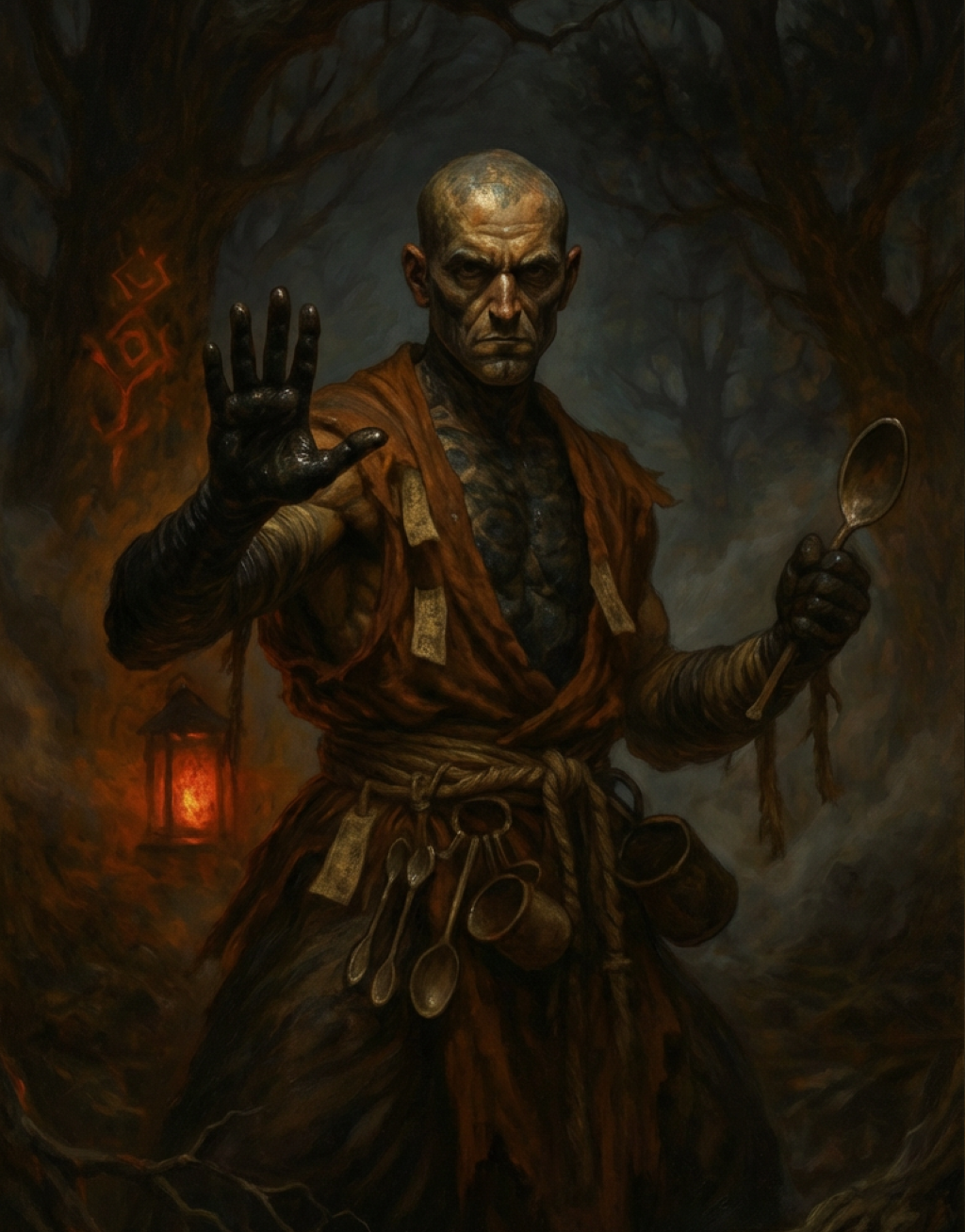 Twice broken by the Devil Nuns’ Tar Trial and cursed with pitch that seeps from his scars on moonless nights, Brool fled into Whisperwood and nearly died before Ylara Thornbrook hauled him home. He’s lived behind her hut ever since, a tar-streaked brawler who expects the world to hit first. Brool fights with anything in reach—books, bowls, spoons—each strike born of pain rather than training. Crosspine calls him “Bob the Re-Tarred” behind his back, but none dare say it to his face.